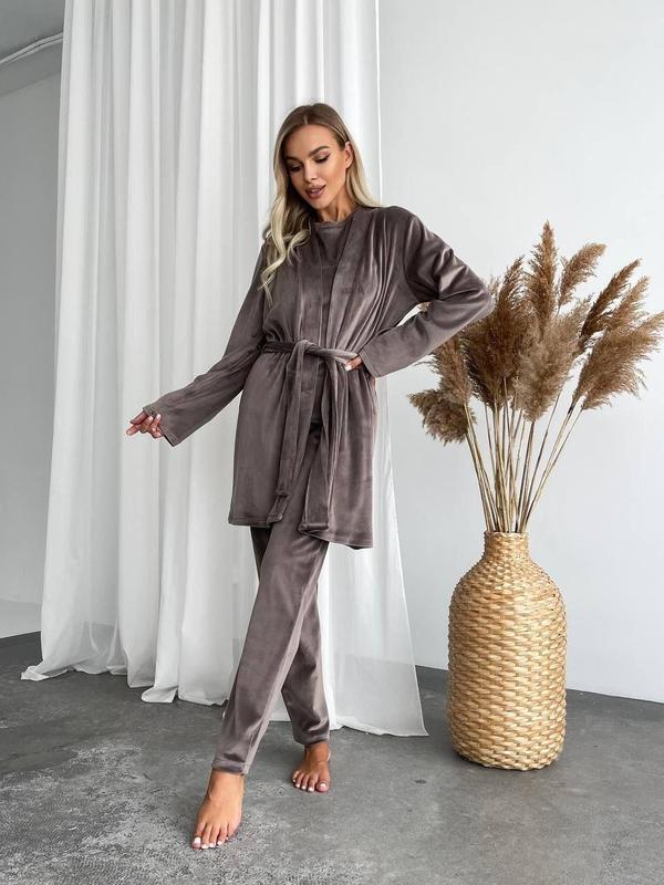 Тёплая зимняя велюровая плюшевая женская пижама домашний костюм тройка мокко цвет