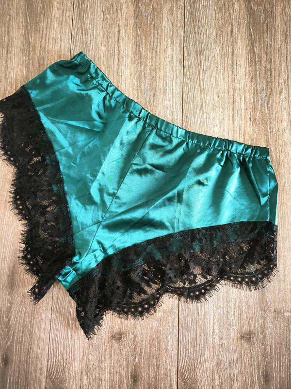 Шортики от пижамы зелёные атласные с черным кружевом. Посадка 28 см. ПО талии 38