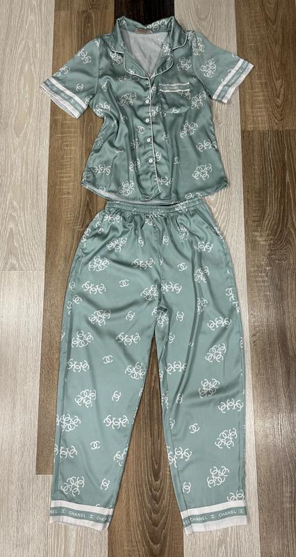 Нежная пижамка в брендовом принте,приятного мятного оттенка Замеры верх: ди 58,ог 46,ширина плеча 9,5,длина рукава 22,ширина по низу 47 низ:ди 89,от 30(на резинке),об 59 внутренние боковые карманы