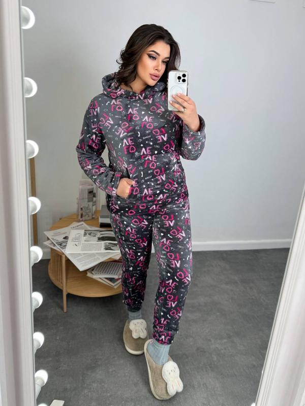 Арт 7132har+ Тканина махра велсофт принт Цвет темно-синий love, графит love, бежевый горох, сиреневый горох Размер 48-50,52-54,56-58 заміри надам за потреби Домашний костюм из очень мягкой и приятной к телу ткани. Кофта с капюшоном и карманом спереди. Брюки высокой посадки, с карманами. Талия на резинке, снизу манжет.