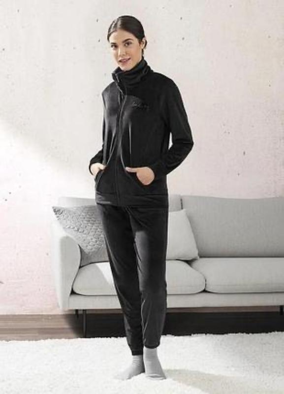Велюровый костюм Esmara Кофта на молнии, пояс брюк - широкая комфортная резинка, есть функциональная лента для регулировки объема, штаны узкие Джоггеры. Очень мягкий и удобный. Отлично смотрится. Для дома и прогулок Размер L44/46 Кофта Певообхват груди 58,5 Рукав 60 Плечи 43 Длина от плеча 68 Штани Полуобхват резинки 42 тянется до 66 Полуобхват бедер 49 Длина 100 Крок 74 Посадка 29/40