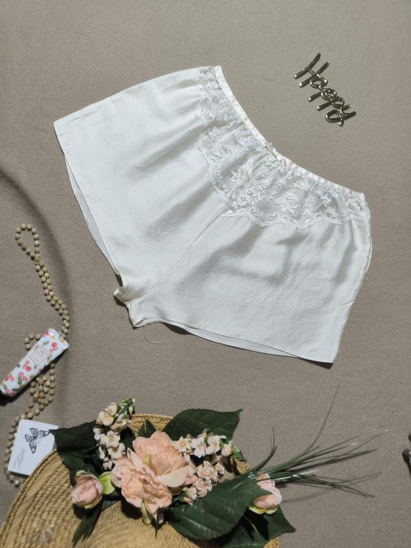 СТОК без отрывных ярлыков Может иметь легкий запах обработки цвет нежно-кремовый, почти белый Кишень нема Тканина тонка не тягнеться 83% шовк 17% полиамид - это пожалуй про кружево Маркировка размера М 38 сбоку должна застегиваться на пуговицу, который потерялся Пол-объем талии 31 Тянеться до 42 Пол-объем бедер ориентовно 52 Посадка 32 По боковой изгибе 26 Пол-объем штанины 31 ориентировочные замеры в спокойном состоянии на последнем фото