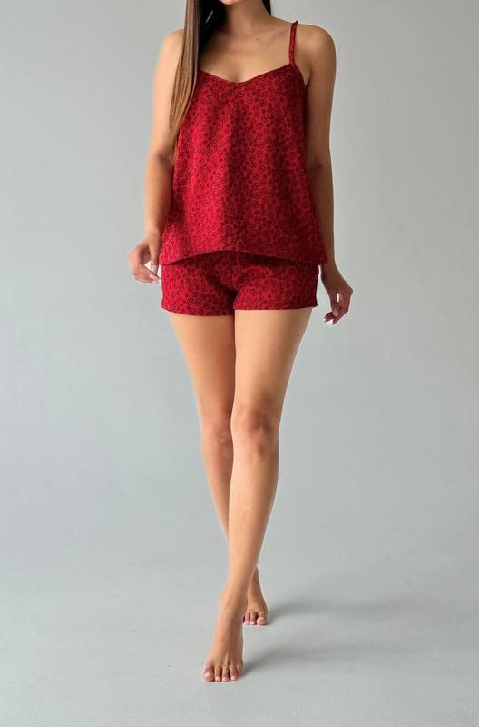 Тканина: креп Размерная сетка: 42,44,46,48,50 Майка на тонких бретелях Шорты на резинке Мы работаем только с доставкой на Новую Пошту с послеплатой! Предоплат у нас нет!