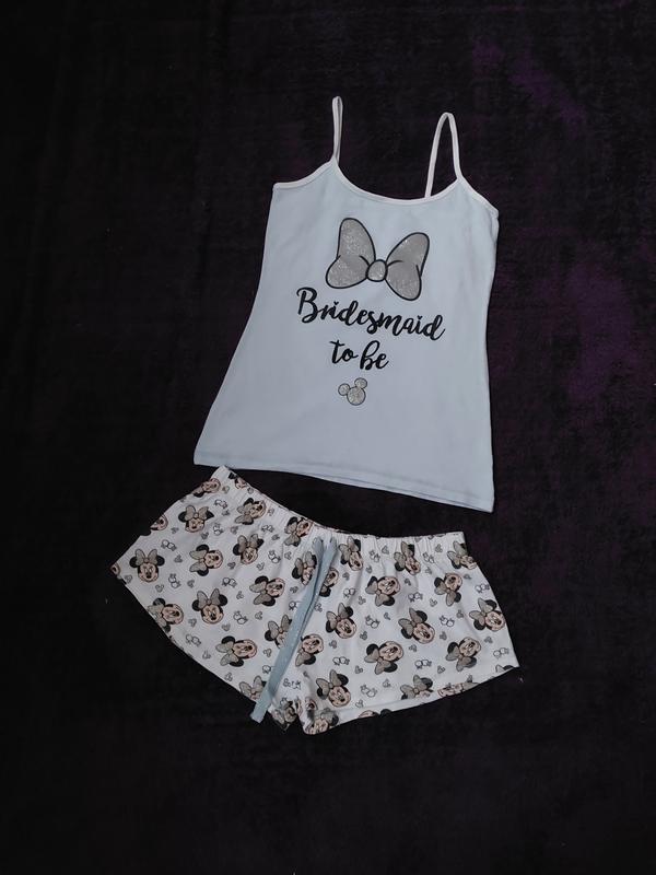 Симпатичная пижамка в отличном состоянии. Длина майки без лямок 45 см, ширина под мышками 35 см. Длина шортиков по боковому шву 20 см, пояс 35 см, пояс на резинке. Тканина тягнеться.