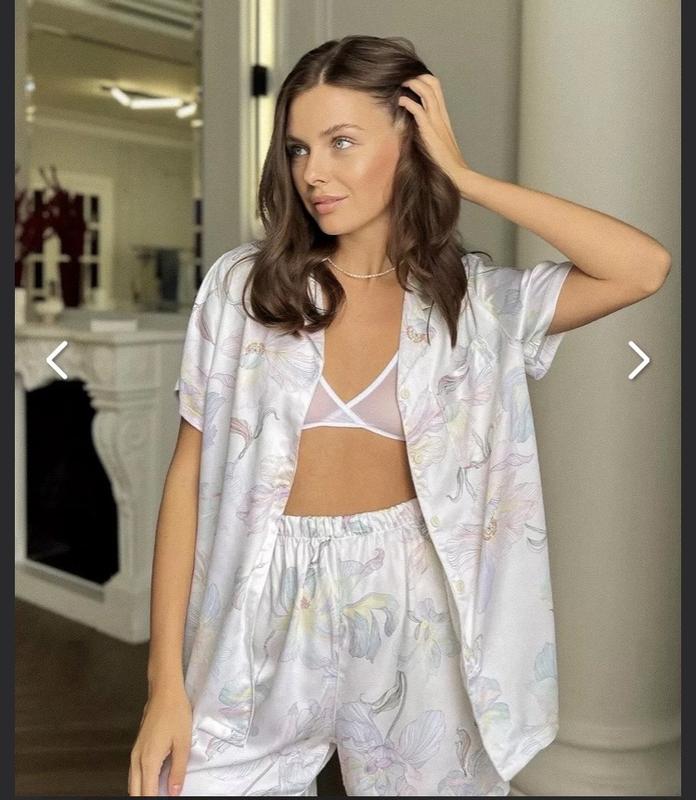Віскозний піжамний комплект з квітковим розписом у світлій гамі. Зручний та приємний на дотик.Тканина має властивість оходження. Дуже стильний!!! Параметри: Обʼєм грудей до 107-115 см Обʼєм стегон до 109-114 см