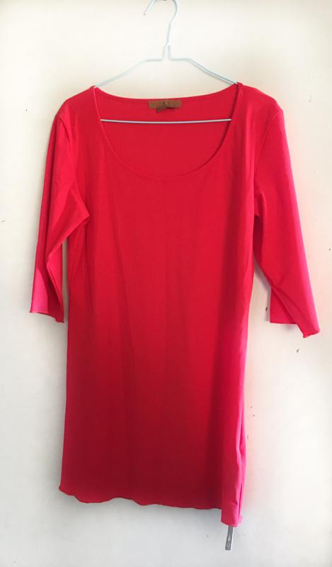 Платье-туника прямого покроя. Можно носить для занятий спортом. Отличная мягкая дышащая ткань lycra, 72% полиамид, 28% эластан. Цвет красно-коралловый, яркий неоновый. Все этикетки бумажные присутствуют.
