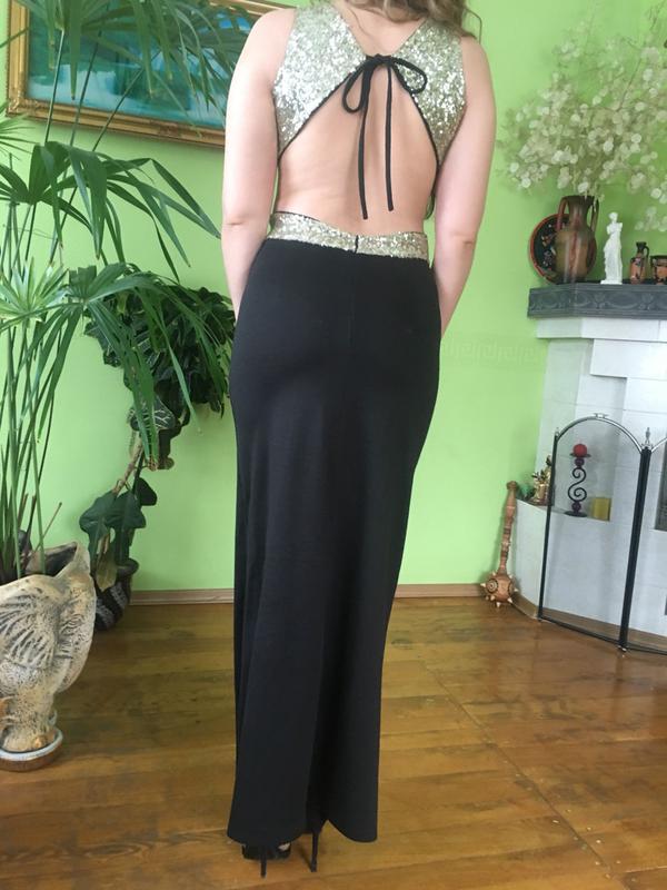 Обалденное вечернее платье с красивенной спиной. Верх с паетками красивого дорогово золотого цвета.