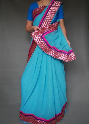 Сарі з якісного красивого матеріалу, по якому йдуть стразики і ніжний малюнок. Стразики блищать і виглядають нарядно. Колір в житті гарніше, ніж на фото. Дуже гарний відтінок блакитного кольору. Прикрашене нарядною тесемочкой. Сарі в стані нового. Дивіться інші мої оголошення. Є великий вибір сарі та іншого індійського одягу https://shafa.ua/member/tanfer/clothes Підписуйтесь!