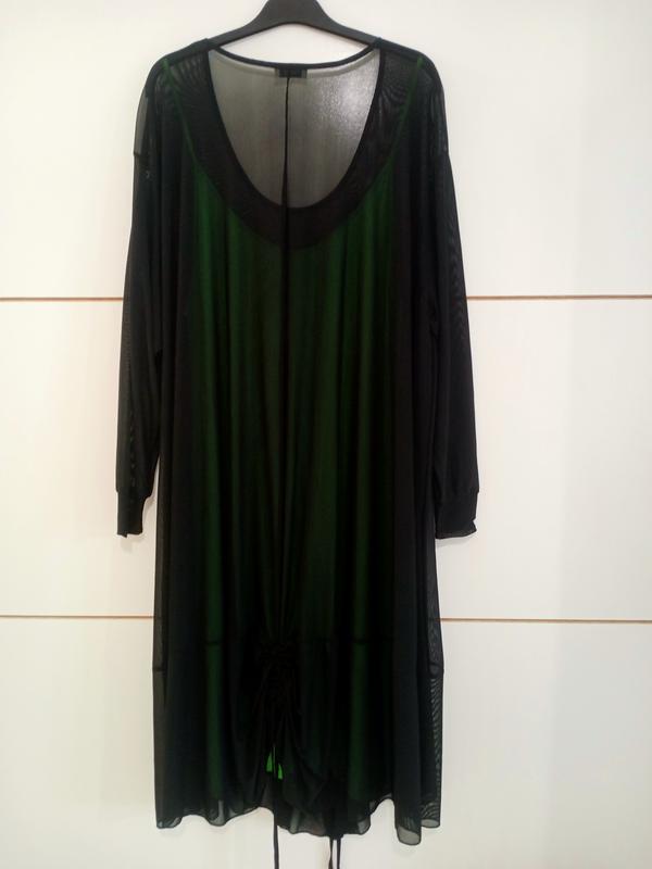 Платье-двойка, новое, производство Турция,. Нижняя часть служит челом, имеет яркий цвет, на тонких брительках, облегающий силуэт. Верхняя часть - чёрная сеточка, свободно падающая, расширена к низу, впереди внизу драпировка, рукавчик, очень нарядный вид. Размер 52-54 (определяется по внутренней части, по чехлу). -- Зеленая часть - ПОГ54, ПОТ662, ПОБ67, Д110. Черная часть - свободным балахончиком.