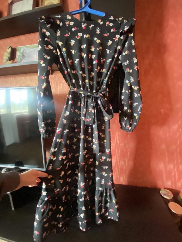 Платье с воланами на плечах, под поясок. На поясе имеется резинка. Размер S-M.