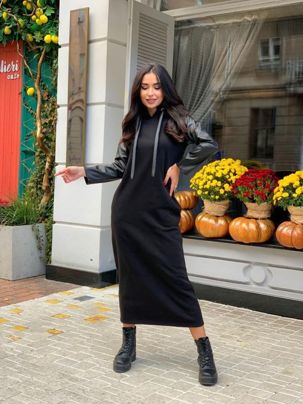 Платье Модель 140mil Ткань: трикотаж трехнитка на флисе, матовая эко кожа на флисе Размеры: 42-44, 46-48, 50-52 Цвет: черный Найдено платье в котором ты точно не замерзнешь ❄ Стильное, удобное и в самом универсальном чёрном цвете. Есть карманы. Практичные рукава из матовой эко кожи на флисе. Декорировано люверсами и шнурком из кожи. Можно завязать на узелки и будет выглядеть еще круче