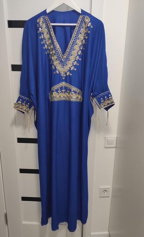 Жіноче плаття- вишиванка, сукня з вишивкою. платье- вышиванка в одному розмірі батал розмір універсальний- з середини регулюється поясом.Нереально красиве плаття вільного крою. без бірок. Блакинте, вишите золотою ниткою. Шикарний візерунок .Можна носити як національне Довжина 140 Пот Пог Поб 82 Рукав від шиї 60