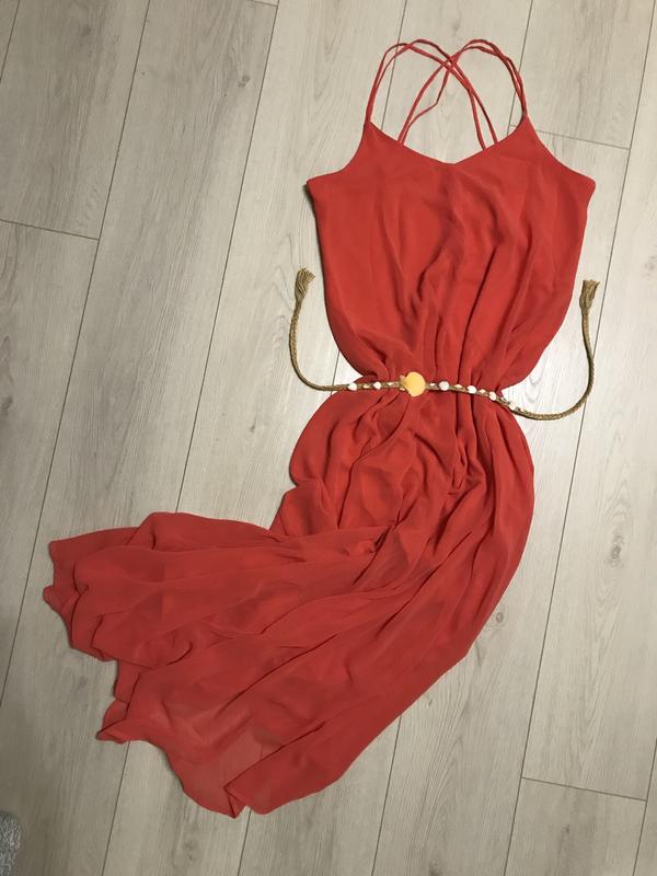 Легка, коралового відтінку сукня Atmosphere, з підкладкою. Приємна до тіла, не сковує рухи. Заміри: Довжина - 130 см Ширина в грудях - 45 см (півобхват) Довжина підкладки - 73 см