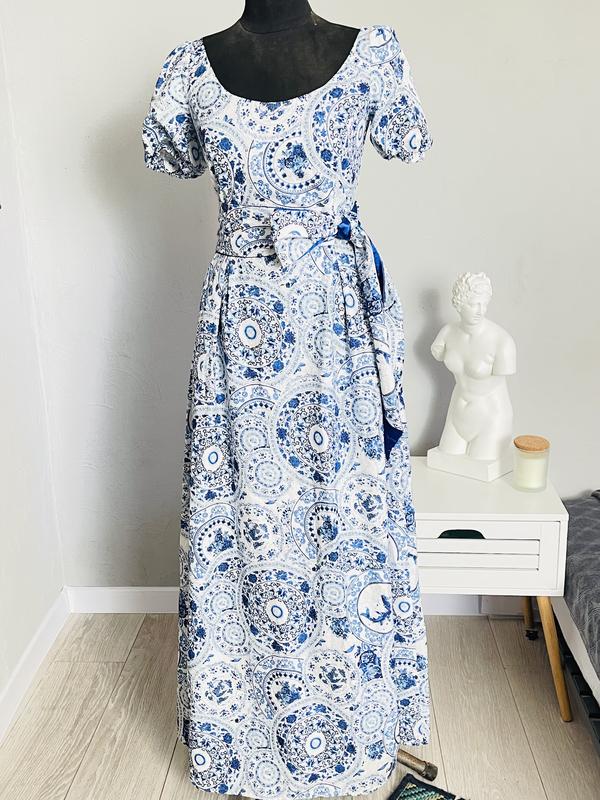 Очень красивое платье в стиле гжель на шелковом подкладе. Наделось 1 раз, размер 42-44 на рост 165-168. Двусторонний пояс.