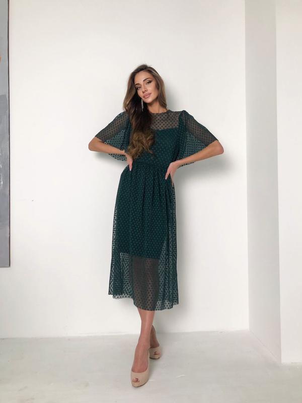 Арт 193 Сукня MIRA midi Шикарна сукня довжини midi, вільна, повітряна, з трендовими горохами і широким рукавом, що не зобов'язується в рухах та стилі. Тканина: сітка-гофре в горошок, спідня сукня трикотаж. Розмір: oversize (42-46) В крою: смарагд, чорний ❗️