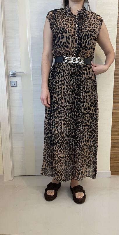 Дуже красива. жіноча чукня! Легка. шифонова. , комірець стійка, оздоблена золотими гудзиками. на талії резиночка. спідниця гафре. на спідниці підкладка. Дуже красивий принт лео. підійде на розмр с та м! Заміри: Довжина 130 см. ПОГ 40 см. плечи 40 см. пот 35 по резинці. розтягується до 45 см.
