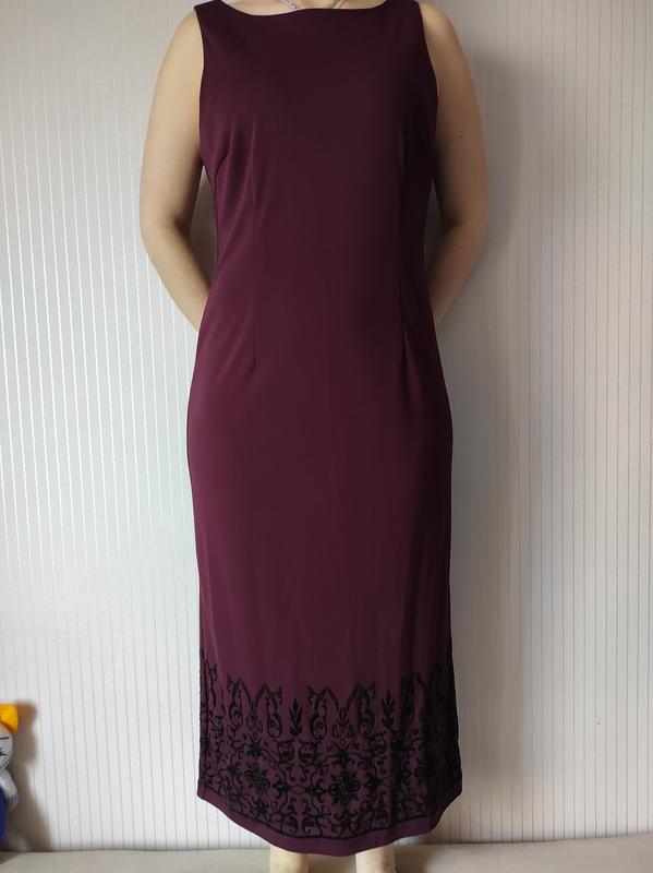 Довга сукня з набивним велюровим малюнком по низу, темно-бордового кольору. Розмір 14, наш 52, тягнеться. Довжина 126, плечі 37-38, ПОГ 50-60, ПІТ 45-50, ПОБІДИ 55-60, низ 56-65, розріз. Стан ідеальний!