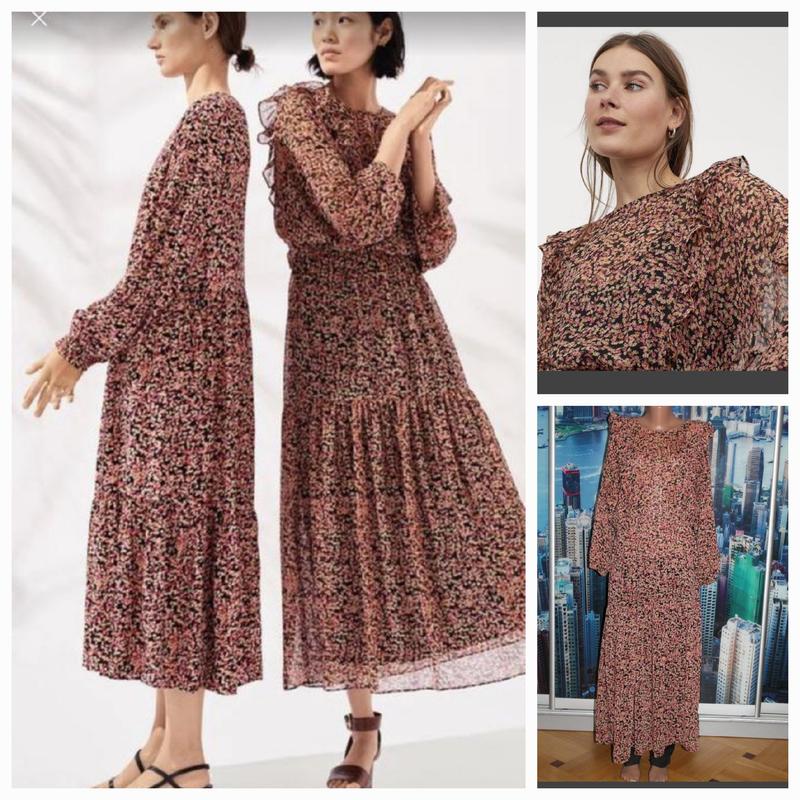 ПОГ вільно довжина 134 підкладки немає длинное платье из воздушной ткани с круглым вырезом горловины и разрезом сзади с потайной пуговицей. Оборки на полочке и сзади на спине, а также длинный рукав «летучая мышь» с узкой резинкой снизу. Отрезная талия на резинке.