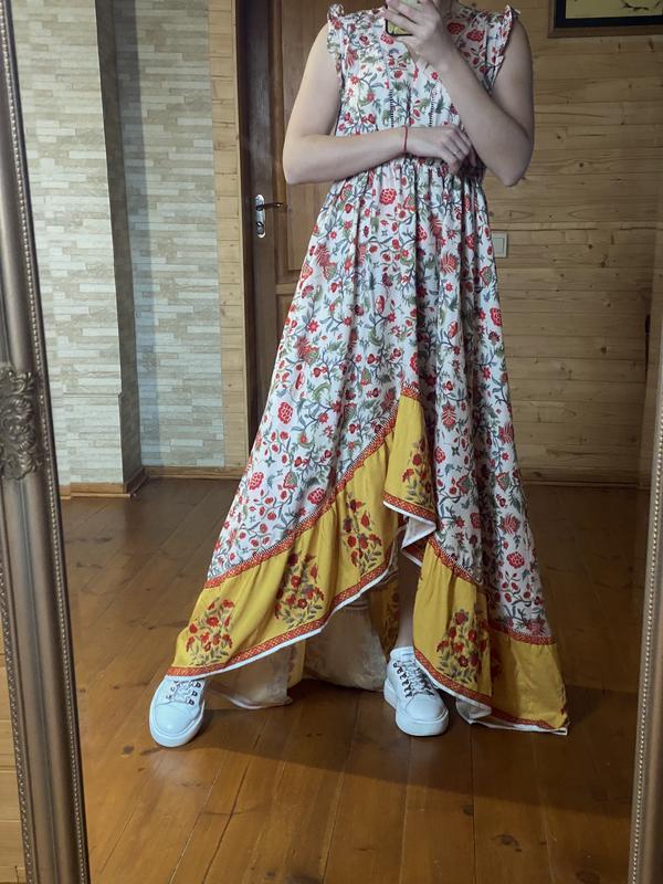 Платье в пол,йдет с асимметрией.На талии резинка тянется.Очень красиво смотрится.Полная опоата на карту.длина 153 см сзади