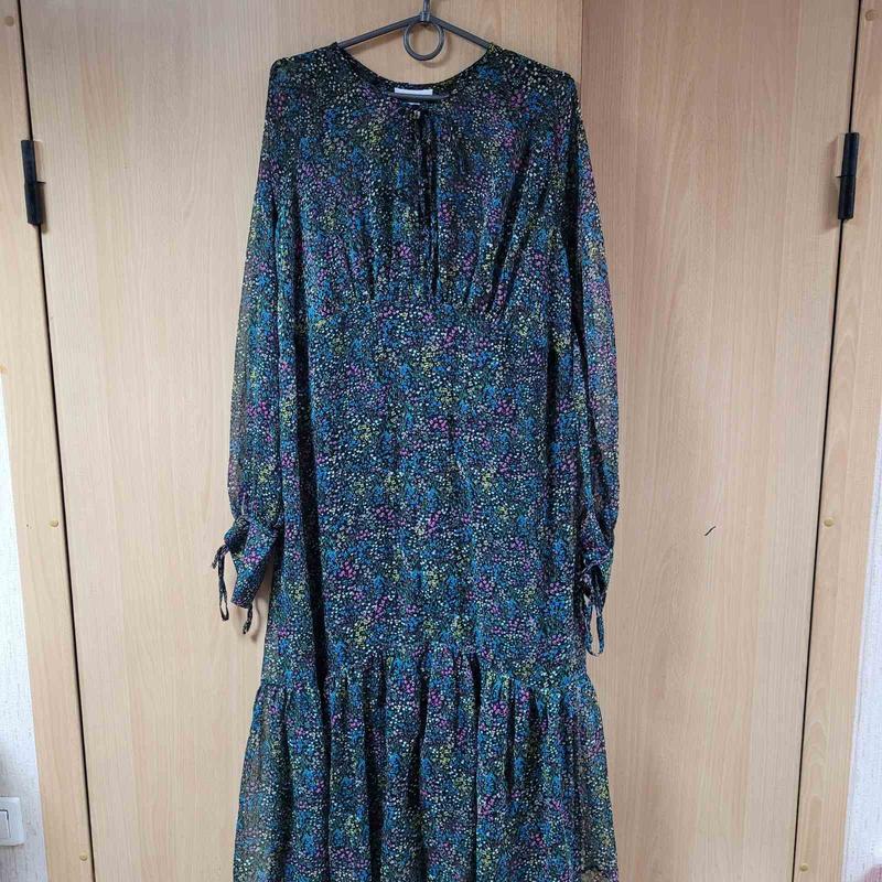 Длинное шифоновое расклешенное ярусное платье с внутренним чехлом.Под грудью кокетка,рукав реглан на манжете с завязкой.Ог 112,Об 128,длина 116,рукав от ворота 78.
