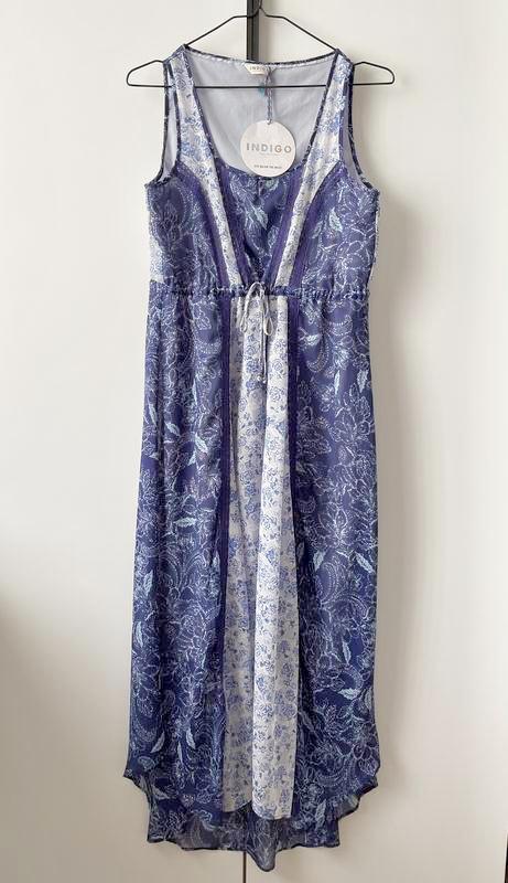 Гарне максі-сукня цікавого крою від Indigo collection M&S. Якісний матеріал, ззаду йде з подовженням, на талії затягується, є підкладка, легкий матеріал, не світиться! Розмір: M/L Колір: синій з блакитним