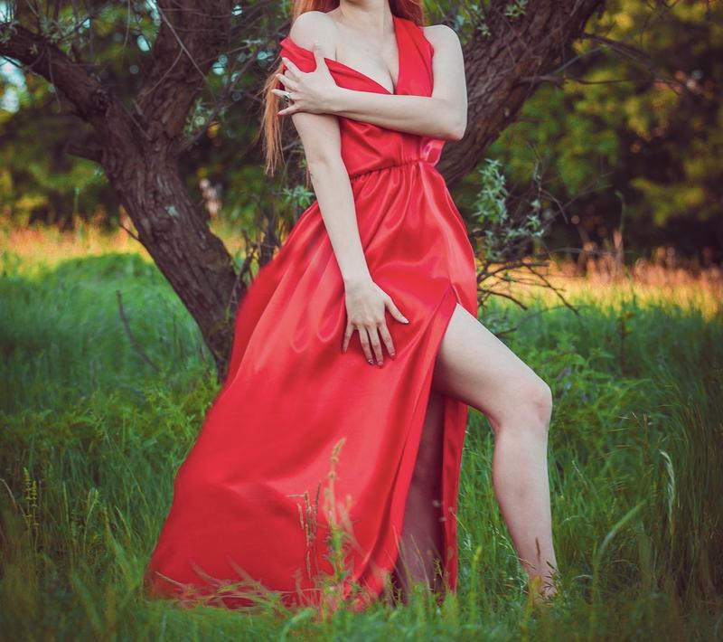 Яскрава довга сукня в червоному кольорі з розрізом по нозі