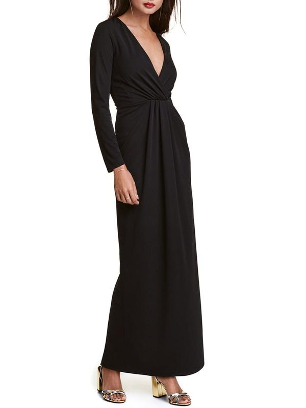 черное длинное платье с декольте от Н&М золотая коллекция сзади потайная молния Длинное платье из плотного трикотажа с драпировкой спереди. На платье - глубокий треугольный вырез и «запах» сверху с пришитыми вкладышами у бюста. Длинные рукава и потайная молния сверху сзади. Отрезная талия. Сзади — разрез. На подкладке. Возможно повреждение бирки. Глибокий винний колір Довжина 150 Груди 48-50 Плечі 41 Бедра 60+ Пояс 40 Рукав 61 Стрейчева тканина На підкладці 👍 до низу