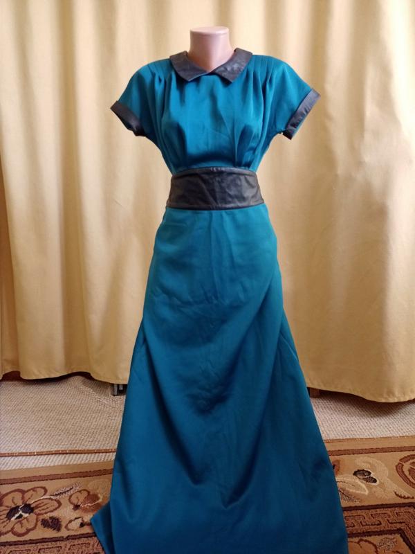 Платье миди изумрудного цвета (фото не передало цвета) 44-46 размера. Элегантный и соблазнительный разрез на плечах до талии. От талии есть потайной замочек. Воротничок, рукавчик и пояс из экокожи.