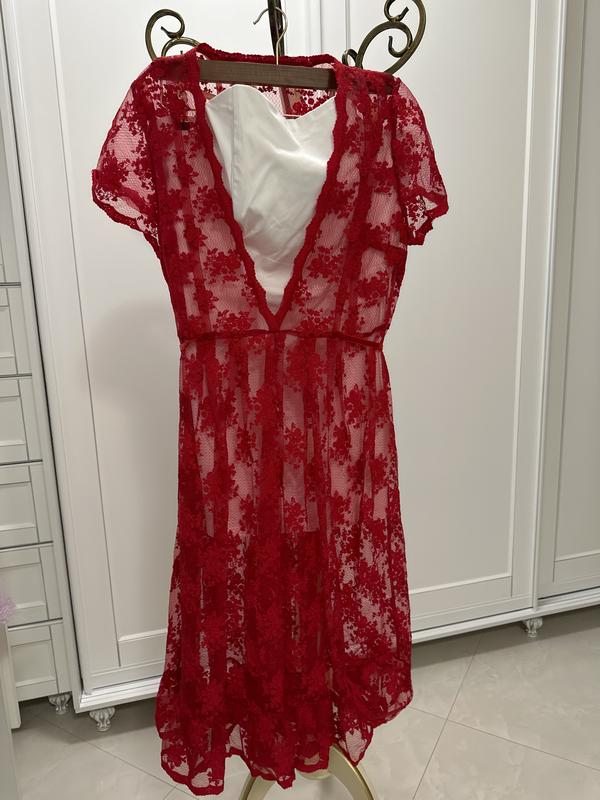 Платье в комплекте с тремя накидками. Таким образом у вас будет 4 полноценных образа Сукня Грудь - 125-127 Талия-117 Бедра -135 Синяя накидка Длина перед - 100 Длина сзада - 125 Белая Длина -100 Красная Длина - 110