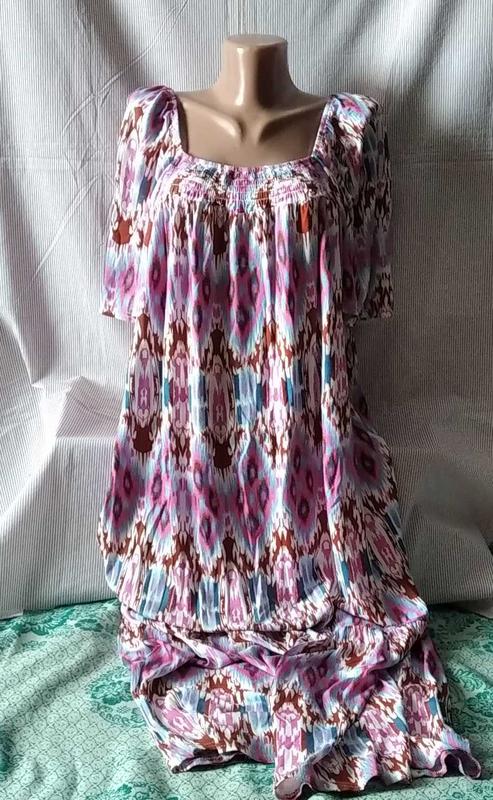 Пречудова. Натуральна,сучасна. З гранжевим принтом,декольте-на багаторядній гумці. Плечі-на гумці.рукав-дзвіночок. ФОТО НА ТІЛІ НЕМАЄ. Довжина 122(від плеча) Завширш(пахви) 48 Річ нова,без паперової бірки -СТОК.