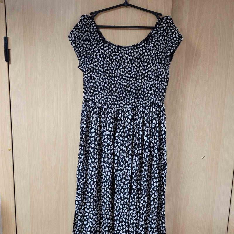 Длинное вискозное платье большого размера.Талия завышена,верх прострочен мелкими резинками,рукав реглан,впереди два разреза.Черное с белыми цветочками.Ог 90/118,Об 180,рукав от ворота 16,длина 134.Новое,без этикетки.
