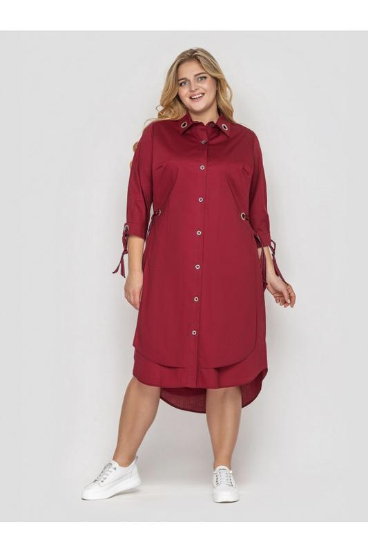 Двухслойное платье-рубашка свободного силуэта, с втачным рукавом 3/4 на манжете. Воротник стояче-отложной на стойке. По полочке застежка-планка на пуговицах. Нижний слой и верхний (отлетной) соединены воротником и планкой. На манжетах, воротнике, верхней отлетной части по линии талии - декор-холитены, через которые по манжету и полочке - спинке крепятся завязки из репсовой ленты. Низ платья разноуровневый закругленный. Рост модели на фото 174 см.