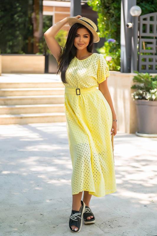 Легкое платье арт. glad. с 61 Размер: 50-52, 54-56 Ткань: прошва натуральный хлопок 100% Цвет: белый, желтый Пояс в комплекте, на талии резинка
