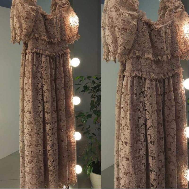 Длинное праздничное платье. Изготовлена из кружева премиум качества. Платье на подкладке, горловина прямоугольного типа, пышный короткий рукав, имеет потайную застежку - молнию на спинке. Верх платья прилегающий к линии талии, от линии талии свободная спадающая юбка. Материал: 97% оескоза, 3% лайкра.