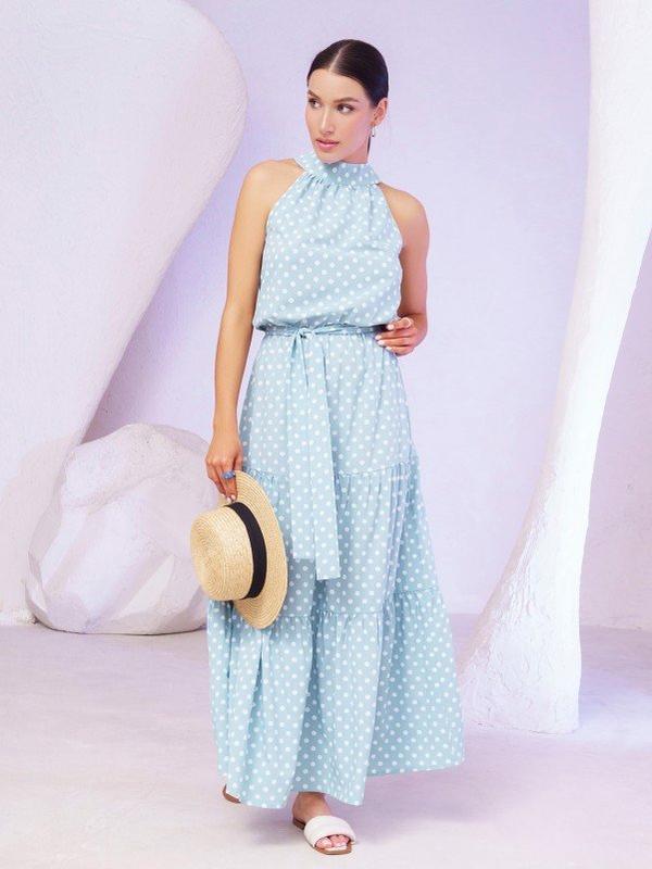 Легкое платье без рукавов с горловиной-халтер на тонкой манжетке с пуговицей. Модель со съемным поясом и воланами выполнена из мятного софта в горох. Платье с резинкой на талии и длинным расклешенным низом.