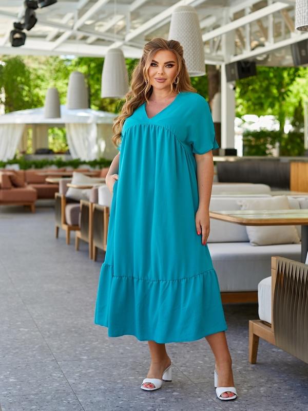 Розмір -50-52,54-56,58-60,62-64 Тканина- американський креп Колір - бордо, джинс,гірчиця , бірюза Сукня з кишенями, вільного крою, на грудях з v подібним вирізом . 50-52 - ог-108, обт- 152, об б-174, довжина сукні-118,довжина рукава-23см 54-56- ог-116, от-160,об-186, дов.-119, дов.р-23, 58-60- ог-122, от -168, об-194, дов.-120,дов.р-24, 62-64 - ог -130, от- 176, об -202, дов-121,дов.р-24. вл
