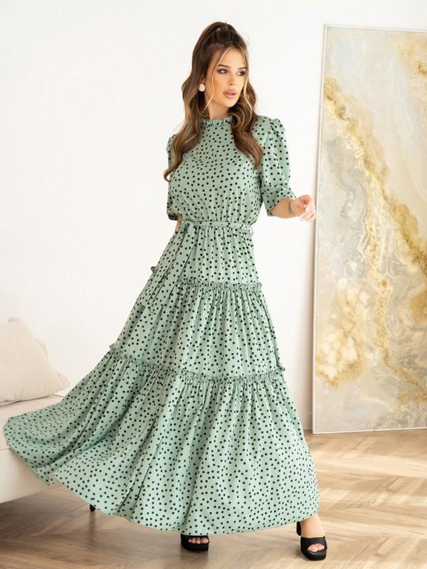13975_хаки Повседневное платье, выполненное из софта цвета хаки в горошек. Модель с макси длиной и расклешенным низом, декорированным рюшами с воланами. Модель со съемным поясом и короткими рукавами, оснащена застежкой по горловине и рюшам. Платье оснащено потайной резинкой на талии.