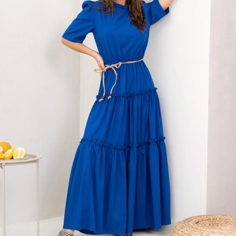13974_синий Длинное платье из софта синего цвета с эластичной резинкой на талии. Платье со съемным поясом и короткими рукавами оснащено застежкой по горловине и рюшам. Модель с расклешенным низом, декорированным воланами и рюшами. Пояс в комплект не входить.