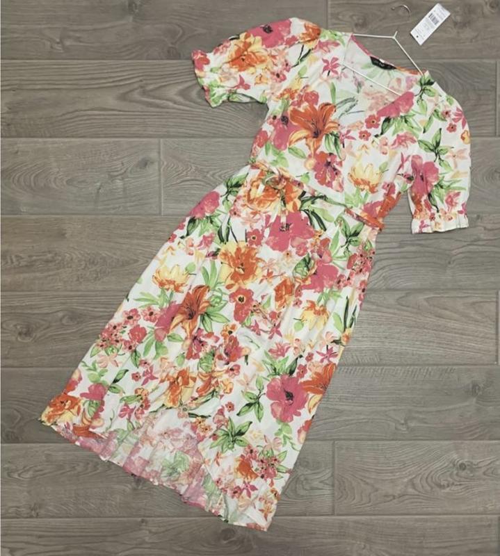 Платье льняное на запах F&F р. 12/40/L Состав: 55% лен, 45% вискоза. Яркий летний цветочный принт. Комфортная и актуальная вещь на лето🌞🌺 ПОГ 52 см (можно больше/менее регулировать благодаря модели на запах) ПОТ 40 см (можно больше/меньше регулировать благодаря модели на запах) ПОБ 60 см +/- Длина по спинке 124 см