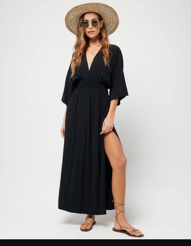Платье сарафан.Спинка немного открыта на завязке, талии широкая резинка,рукав широкий комано.С разрезом сбоку.Разрез не большой..Легкое,воздушное.по размеру будет 56-62