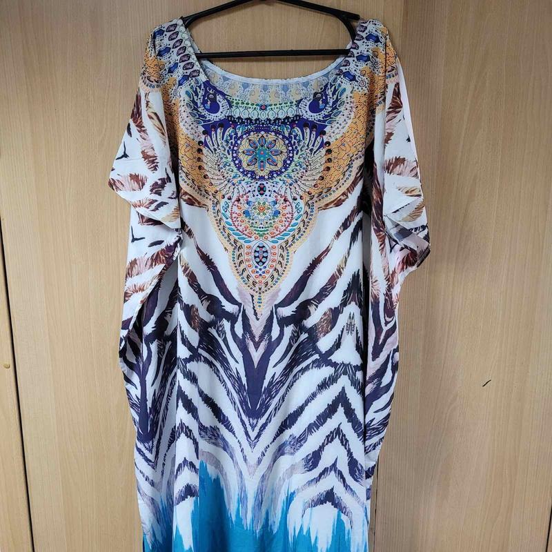 Длинное платье очень большого размера,расклешенное,Новое,без бумажной этикетки,рукав спущенный,по бокам разрезы.Очень приятное на ощупь.Обхват 178,рукав от ворота 32,длина 138.