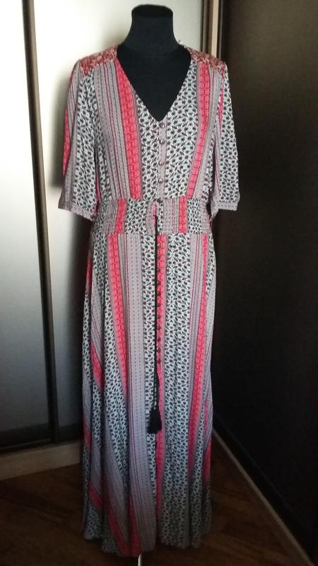 Платье в пол Новое, но этикетки нет. Плечи 40 см ПОГ - 50 - 52 см ПОТ 40 см (резинка тянется до 50 см) ПОБ - 80 см - свободно Длина замер по спинке -142 см. Спереди, пуговицы не до конца Дополнительные замеры по запросу Состав: 100% вискоза