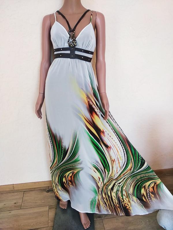 Очень красивое шифоновое платье в пол. Идеальна для выпускного, празднования свадьбы, корпоратива, другого мероприятия. Особенно с аксессуаром-корсетом. Без корсета можно надевать хоть каждый день. Шифон класса люкс, пошита качественно - ровные строки, нигде не торчат нити. Внутри приятный к телу подклад, за счет которого платье не просвечивается. Сбоку на молнии. Брители регулируются. Купила дорого в бутике свадебных платьев. Одягала один раз. Стан идеален! Размер М-L. Длина от плеча 145 см.