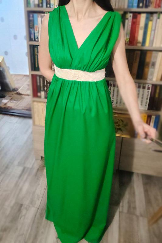 Зеленое длинное платье, было пошито для дружки, одевалась один раз. Длина по спинке - 136 см, длина от плеча - 148 см; Полуобхват талии - 34 см; Полуобхват груди - 38 см.