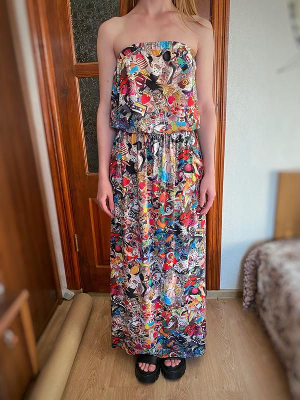 Яркое длинное платье без бретелей, с открытым верхом. Принтованная разнообразными рисунками. Сверху держится на резинке. Резинка также находится в районе талии. Снизу по бокам есть разрезы. Очень невесомая и отлично подойдет на лето. Ткань приятная. Наделась один раз в далеком прошлом. Недостатков словно нет. Причина продажи: вообще за неезерила и только что нашла в шкафу. Уже не подходит под мой гардероб. Мой рост 167 см. Мне она полностью по полу. На фото я в босоножках с подошвой где-то 4-5 см и тогда не касается пола. На бирке указан 42 размер. В табличке это показано как XL, но мой размер М и нормально сидит. Резинка чудово тягнеться.