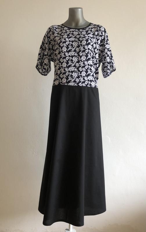 Длинное платье из натуральных тканей. Верх с цельнокроенным рукавом, из тонкой ткани, низ из более плотного материала, тоже из хлопка. Платье прямое, необременительное, слегка расширенное к низу. Можно носить и с поясом, и без. В наличии размеры от 44 до 60