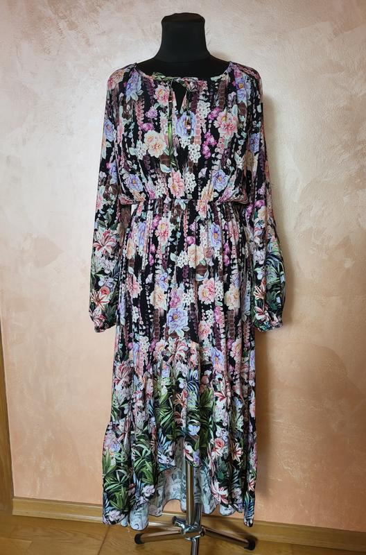Длинное платье с асимметричным низом с красивым цветочным принтом.Очень красиво смотрится на теле.Замеры запить перед покупкой.