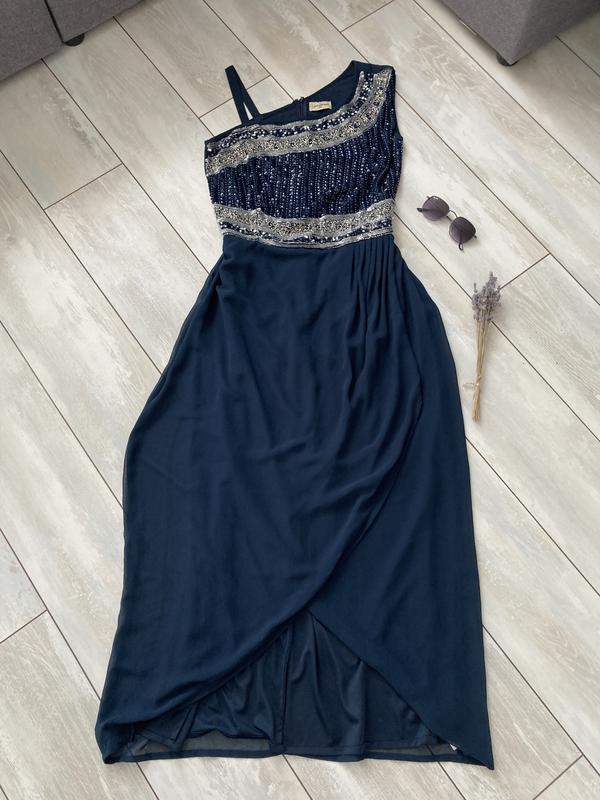 Очень красивое синее платье в греческом стиле с вышивкой спереди и открытым плечом от Lace and Beads. Красиво сидит и подчеркивает фигуру. Размеры: длина по спине посередине 129, спереди до разреза 104, грудь 45-47, талия 43-45, бедра свободные (55-58)