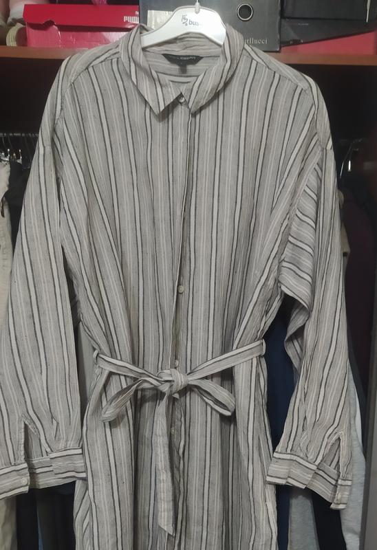 Льняное платье -халат,по бокам карманы,пояс съёмный,по бокам небольшие разрезы,рукав приспущен.