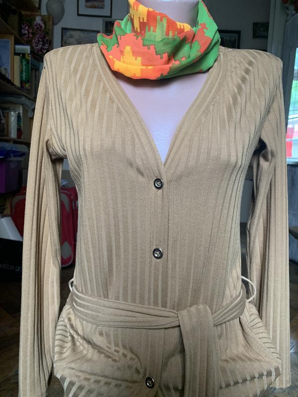 Трикотажное бежевое платье-кардиган с золотистыми металлическими пуговицами и поясом, по бокам разрезы 15 см, Турция